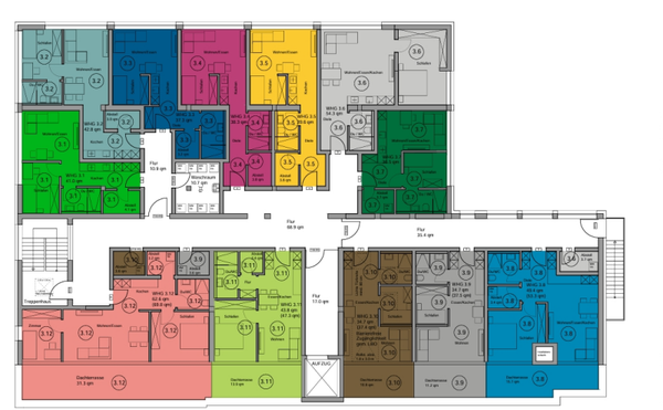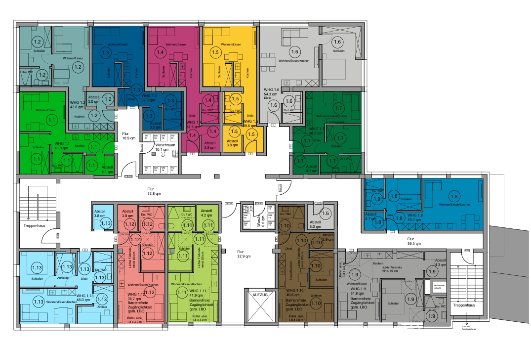 Dieses moderne Mehrfamilienhaus erstreckt sich über vier Etagen und umfasst 51 Wohneinheiten sowie eine Gewerbeeinheit, die alle barrierefrei per Aufzug erreichbar sind. Die 1,5- bis 3-Zimmer-Apartments bieten Wohnflächen zwischen 37 m² und 70 m² für effizientes und komfortables Wohnen. Für maximale Energieeffizienz und niedrige Betriebskosten sorgt der hohe Effizienzhaus-Standard 55 EE, umgesetzt durch eine Luft-Wasser-Wärmepumpe, eine Photovoltaikanlage, Vollwärmedämmung und dreifach verglaste Fenster für optimalen Wärme- und Schallschutz.